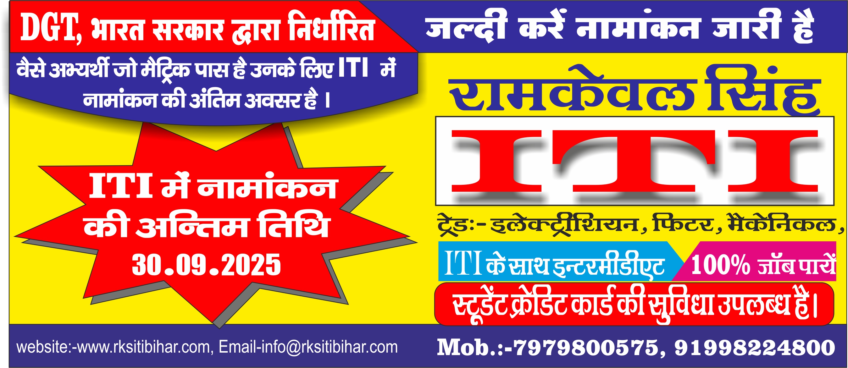 वैसे अभ्यर्थी जो मैट्रिक पास है! उनके लिए आईटीआई में नामांकन की अंतिम अवसर है जल्द से जल्द संपर्क करें!ट्रेड -इलेक्ट्रीशियन, फिटर, मैकेनिक डीज़ल, सेशन -2025-2026,2025-202